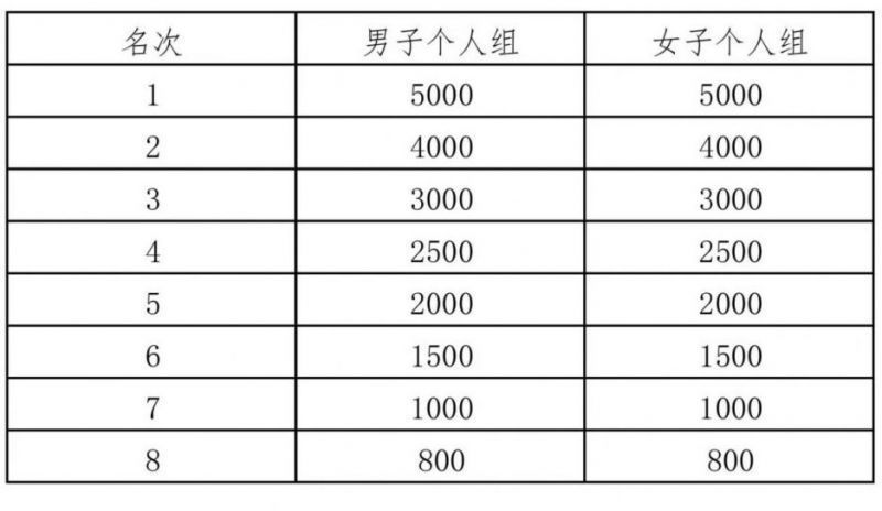 男、女前八名的运动员,分别获得以下奖金(人民币,单位:元),前三名各颁发奖杯一座,需配合现场颁奖等仪式。