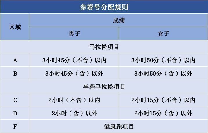 赛事抽签结束后,组委会通过对所有获得参赛资格的选手的马拉松个人最好完赛成绩进行成绩校验并以此为依据对选手进行站位分区。其中A区为马拉松项目选手集结,B、C区为半程马拉松项目选手集结,D区为欢乐跑项目选手集结,E区为欢乐跑(亲子跑)项目选手集结。赛事当天请参赛选手按对应区域进行检录和集结。